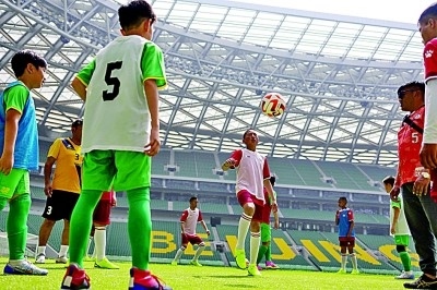來(lái)自青海玉樹的40名藏族青少年參加“青海玉樹藏族青少年北京行”公益活動(dòng),與國(guó)安少年足球隊(duì)交流。新華社發(fā)
