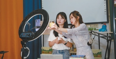 沈珺(右)在指導學生進行直播營銷。汪玉瑩攝