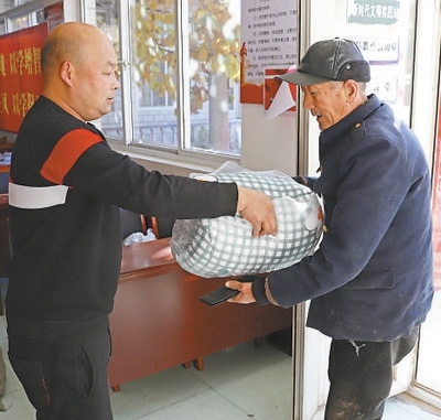 上午10時(shí),走進(jìn)碼頭村黨群服務(wù)中心,正碰上73歲老人杜金亭騎著電動(dòng)三輪車,載著老伴來(lái)領(lǐng)新棉被。為保障困難群眾冬季取暖,涿州市民政局為全市殘疾人、“六類人群”免費(fèi)發(fā)放過冬棉被。杜金亭的老伴肢體殘疾,是低保戶?!靶路颗渖闲旅薇唬@個(gè)冬天不愁了!”取上新棉被,杜金亭邀請(qǐng)記者去新家看一看。
