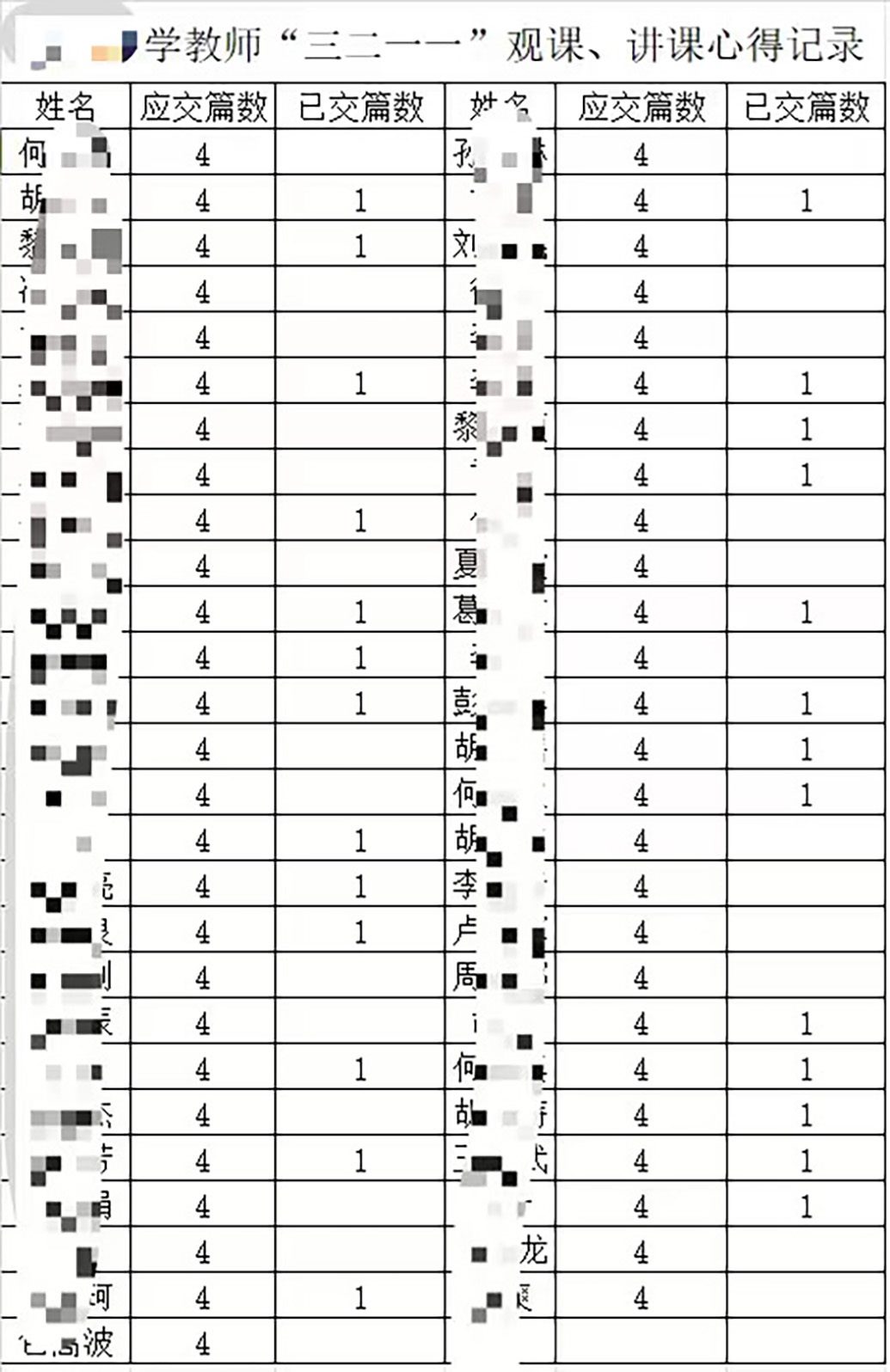 作為班主任,她承擔(dān)管理班級(jí)的責(zé)任,學(xué)校為了“看見”管理內(nèi)容,會(huì)安排教師們填寫各種各樣的表格,包括每日缺勤記錄表,每日、每周、每月、每學(xué)期的安全記錄表,班主任工作手冊(cè),行為規(guī)范課堂記錄表,家訪表,家長(zhǎng)會(huì)座談表等。表格一多,何雪夕免不了“造假”。