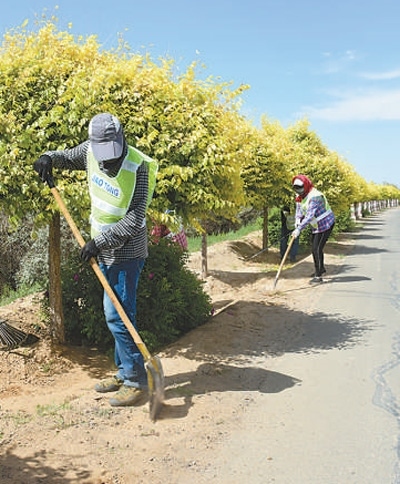 磴口縣防沙治沙局森林管護大隊工作人員在為堤防公路兩側(cè)的林帶除草。張 棖 邢 皓攝影報道