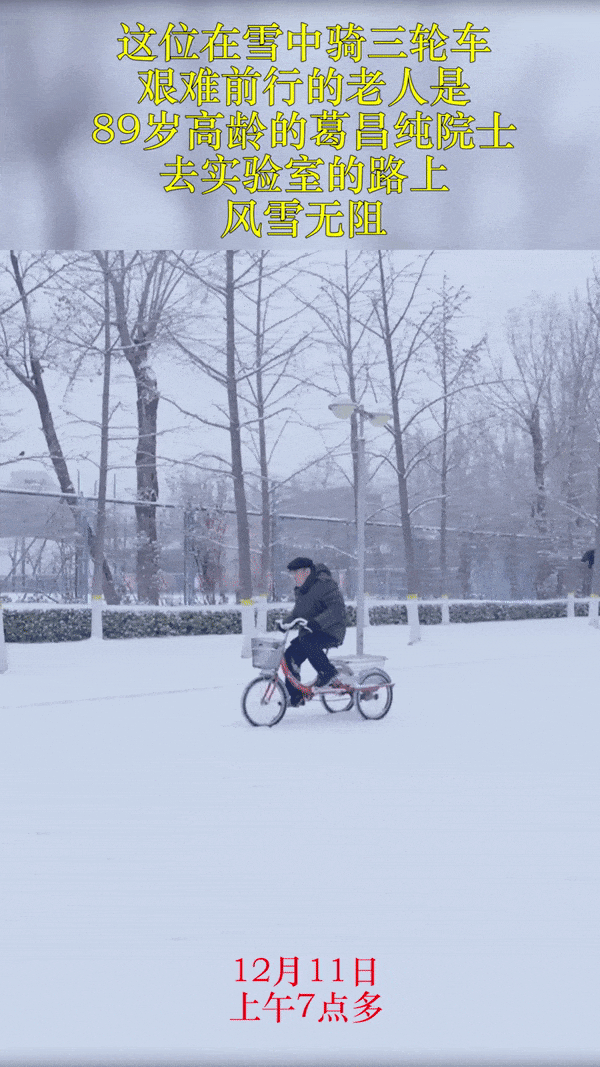 近日,早上7點(diǎn)多,北京降雪后,在北京科技大學(xué)的校園內(nèi),拍到感人一幕。茫茫白雪中,一位老人吃力地蹬著三輪車(chē)緩緩地前進(jìn),風(fēng)雪無(wú)阻。老人是89歲的葛昌純?cè)菏?,這天早晨,他正騎車(chē)前往實(shí)驗(yàn)室,而騎著三輪車(chē)去實(shí)驗(yàn)室,是葛老幾十年如一日的堅(jiān)持。葛昌純?cè)菏渴侵瞬牧?、粉末冶金以及先進(jìn)陶瓷專家,是我國(guó)“核工業(yè)功勛”人物,為“兩彈一星”事業(yè)作出了重要貢獻(xiàn)。