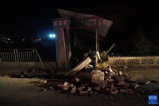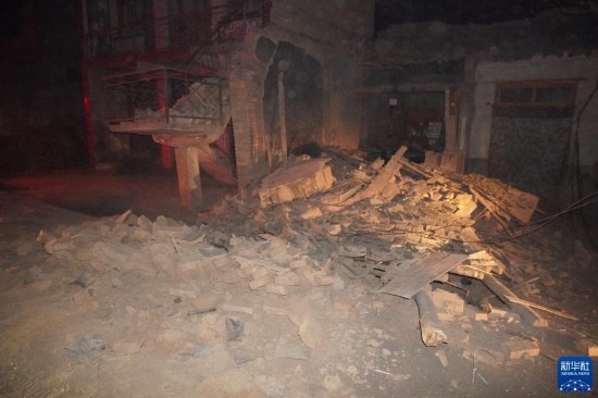 這是12月19日凌晨在甘肅省臨夏回族自治州積石山保安族東鄉(xiāng)族撒拉族自治縣大河家鎮(zhèn)陳家村拍攝的一處倒塌的房屋。