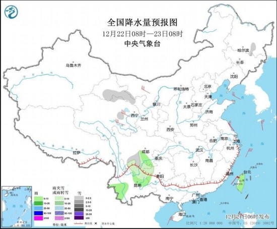 12月22日08時(shí)至23日08時(shí),山東半島、青海北部和東部、甘肅河西、四川南部、貴州西北部、云南東北部等地部分地區(qū)有小雪或雨夾雪,其中,山東半島北部等地部分地區(qū)有中雪。四川盆地南部、云南西南部和中部、臺(tái)灣島大部等地部分地區(qū)有小雨。內(nèi)蒙古西部、青海東部和南部等地部分地區(qū)有5~7級(jí)風(fēng)(見圖4)。