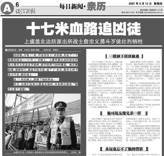 2007年9月13日出版的《錢江晚報》A6版,報道了詹忠義烈士的事跡。在題為《十七米血路追兇徒——上虞蓋北邊防派出所戰(zhàn)士詹忠義勇斗歹徒壯烈犧牲》的報道中寫道:
