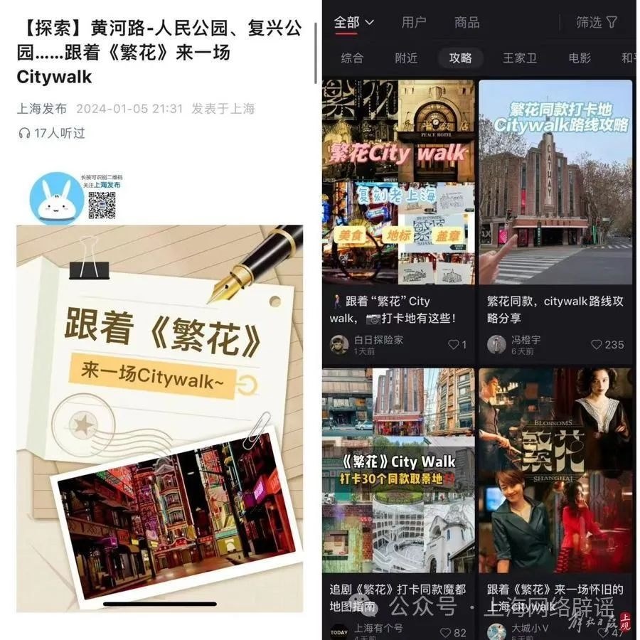 央視網消息:據上海網絡辟謠微信公眾號消息,電視劇《繁花》近日熱播,帶火了和平飯店、黃河路、進賢路等劇中出現的地標、路段,市民游客爭相打卡。誰知,這一熱度也被造謠生事者嗅出了“商機”——連續(xù)數日,“繁花Citywalk(城市散步)收費3公里520元”的話題登上某社交平臺熱榜。兜馬路竟然也要收費,而且代價不菲?上海辟謠平臺調查發(fā)現,并沒有。