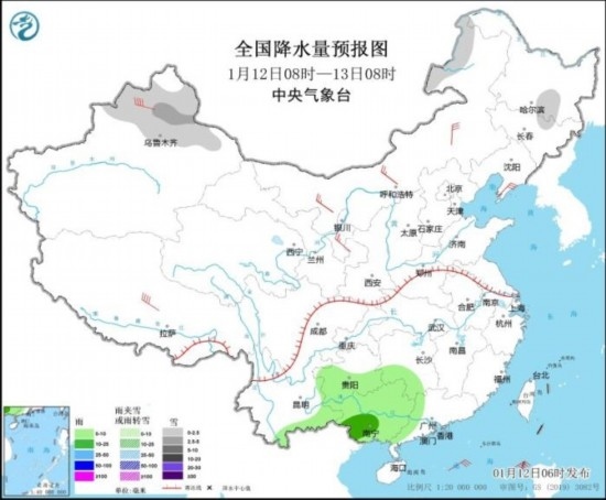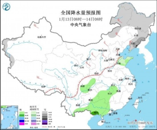全國降水量預(yù)報(bào)圖(1月12日08時(shí)-13日08時(shí))