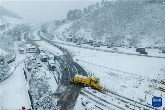 1月22日,在湖南省婁底市一高速收費(fèi)站,除雪車在作業(yè)(無(wú)人機(jī)照片)。近日,受寒潮天氣影響,我國(guó)多地迎來(lái)降溫降雪天氣,各地積極組織相關(guān)部門開(kāi)展抗凝除雪工作,保安全保暢通。新華社發(fā)(吳永華攝)