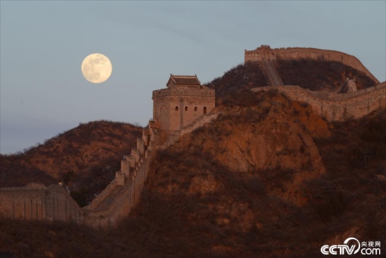 2024年1月25日,農歷臘月十五,河北承德,傍晚時分,圓月映襯下的金山嶺長城,唯美壯觀。