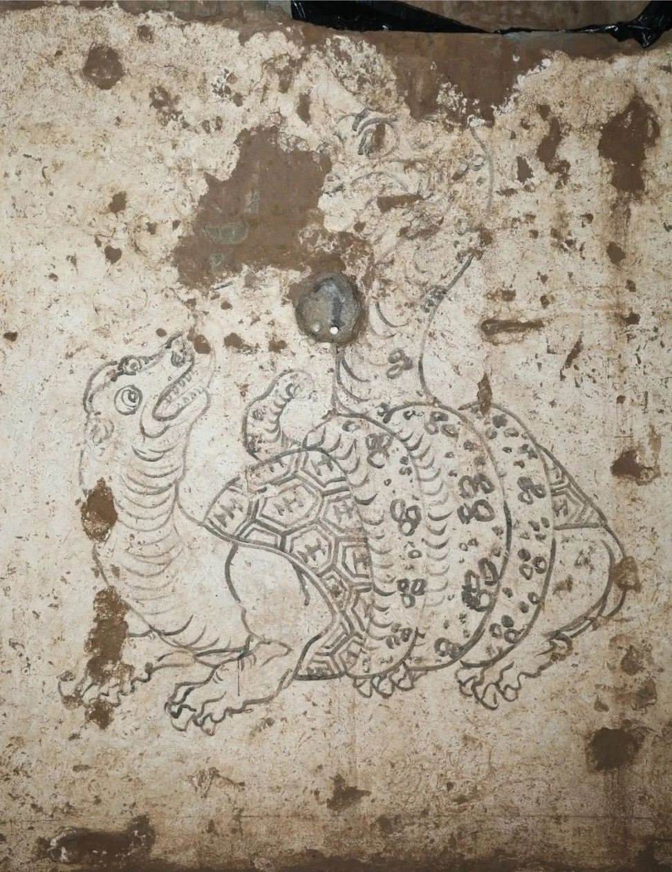 墓道處壁畫保存較差,僅墓道口處保留有少量畫面,兩壁分別為青龍、白虎圖樣;甬道兩側(cè)分別繪有三個(gè)侍女,僅存下半身;墓室東壁為樂舞圖,呈三段式布局,其中南側(cè)為十人組成的樂隊(duì),中部為女舞者,北部為觀看的貴婦(應(yīng)為墓主)及侍女;墓室北壁東側(cè)中心為一坐于方形高背扶手椅貴婦(應(yīng)為墓主),兩側(cè)站立有侍女,應(yīng)為表現(xiàn)墓主日常生活場(chǎng)景;墓室北壁西側(cè)為玄武圖,形象巨大,十分靈動(dòng);墓室西壁為六扇屏花草,畫面簡(jiǎn)單且潦草;墓室南壁為朱雀,呈雙翅展開欲騰飛狀。該墓壁畫布局充實(shí)完整,畫面惟妙惟肖,內(nèi)容上有一定程度反映了墓主生前生活,體現(xiàn)出墓主情趣高雅,深居簡(jiǎn)出,柔貞以靜好,有美婦之懿烈兼瞿母之慈仁。墓葬壁畫整體上風(fēng)格及年代與讓皇帝李憲墓極為相近,或?yàn)楣灿靡环郾舅L制。