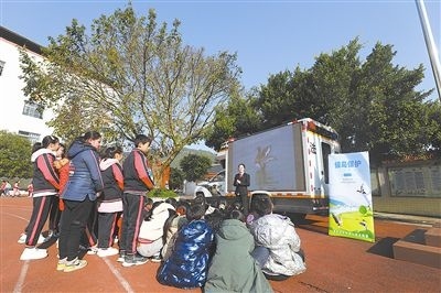 干警利用“車(chē)載便民法庭”播放宣傳片,教孩子們認(rèn)識(shí)棲息在當(dāng)?shù)氐恼滟F候鳥(niǎo)。