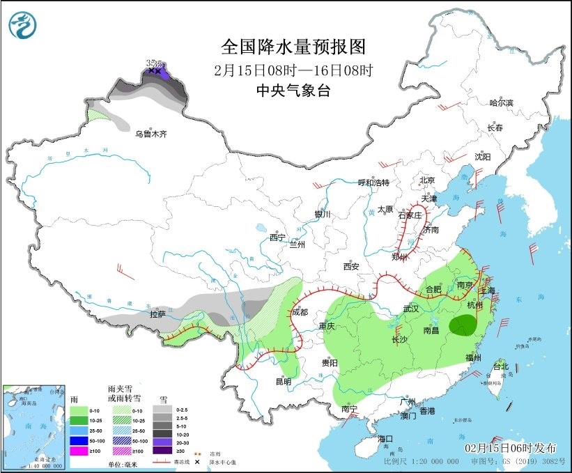 2月15日08時至16日08時,新疆北部、西藏東部和南部、川西高原中北部等地部分地區(qū)有小到中雪或雨夾雪,其中,新疆阿勒泰地區(qū)有大到暴雪,部分地區(qū)有大暴雪,局地特大暴雪(30~35毫米)。江淮大部、江漢東部、江南、西南地區(qū)東部、華南西部等地部分地區(qū)有小到中雨。西藏中部、內(nèi)蒙古大部、遼寧西部、遼東半島、山東半島、江蘇南部、上海、湖南中北部等地部分地區(qū)有4~6級風,其中,浙江中東部部分地區(qū)有6~7級風;黃海大部海域、東海大部海域、臺灣海峽有7~8級、陣風9級的大風(見圖3)。