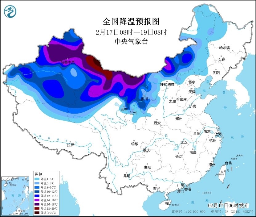 預計,2月17日08時至19日08時,新疆大部、內(nèi)蒙古中西部、甘肅大部、寧夏、青海北部等地將先后降溫6~12℃,其中,新疆北部、內(nèi)蒙古西部、甘肅河西等地部分地區(qū)降溫可達12~20℃,局地20℃以上。