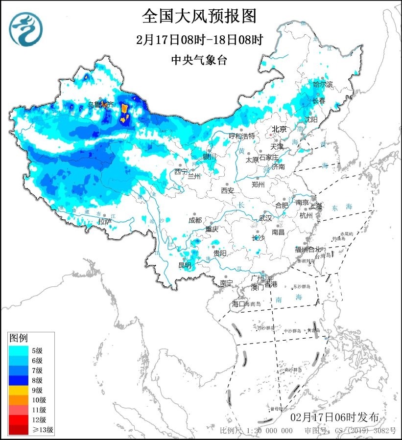 2月18日08時至19日08時,新疆南疆盆地、內(nèi)蒙古西部、青海西南部、西藏西部、甘肅西部等地將有5~6級、陣風7~9級的大風;渤海、渤海海峽、黃海大部海域、東海北部海域將有7~8級、陣風9級的大風。