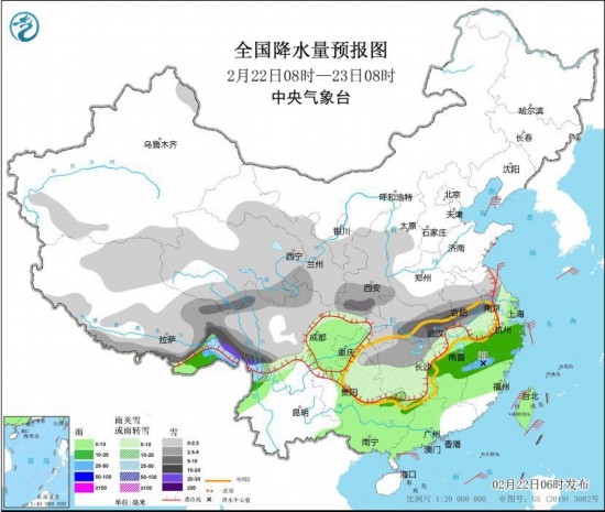 預(yù)計(jì),2月22日8時(shí)至23日8時(shí),陜西南部、安徽中部、湖北中東部、四川盆地東北部以及西藏東部、青海南部、云南西北部等地部分地區(qū)有大雪,其中,西藏東南部、湖北東部等地部分地區(qū)有暴雪(10~15毫米)。上述部分地區(qū)新增積雪深度3~6厘米,局地可達(dá)8~10厘米;安徽中南部、江蘇西南部、浙江西北部、湖北中東部和南部、湖南大部、江西西北部、貴州東部、重慶東南部等地的部分地區(qū)有凍雨或冰粒,凍雨量1~5毫米,局地10毫米以上。中央氣象臺2月22日6時(shí)繼續(xù)發(fā)布暴雪黃色預(yù)警和冰凍黃色預(yù)警。廣西東北部、湖南南部、江西中北部、浙江、福建西北部、廣東中西部和西南部沿海等地的部分地區(qū)有中到大雨,局地伴有雷暴。