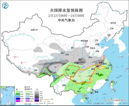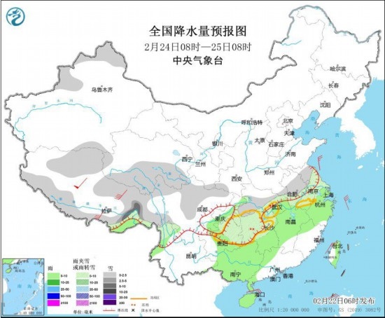 2月23日8時(shí)至24日8時(shí),西藏南部和東部、川西高原、云南西北部、貴州中東部、西北地區(qū)中東部、山西西部、黃淮西部、江淮、江漢、江南北部和西部等地部分地區(qū)有小到中雪或雨夾雪,其中,西藏東部、川西高原北部、陜西南部、安徽中部等地部分地區(qū)有大雪,局地暴雪。西藏東南部、江西中部、福建西北部、云南西北部、廣西東北部等地部分地區(qū)有中到大雨,其中,西藏東南部局地有暴雨(50~90毫米)。西藏中西部、川西高原、遼東半島等地部分地區(qū)有5~6級風(fēng),其中,西藏西部、川西高原北部等地部分地區(qū)有7~8級風(fēng);渤海、東海、臺灣海峽、臺灣以東洋面、巴士海峽、南海東北部海域有6~7級風(fēng)、陣風(fēng)8~9級。