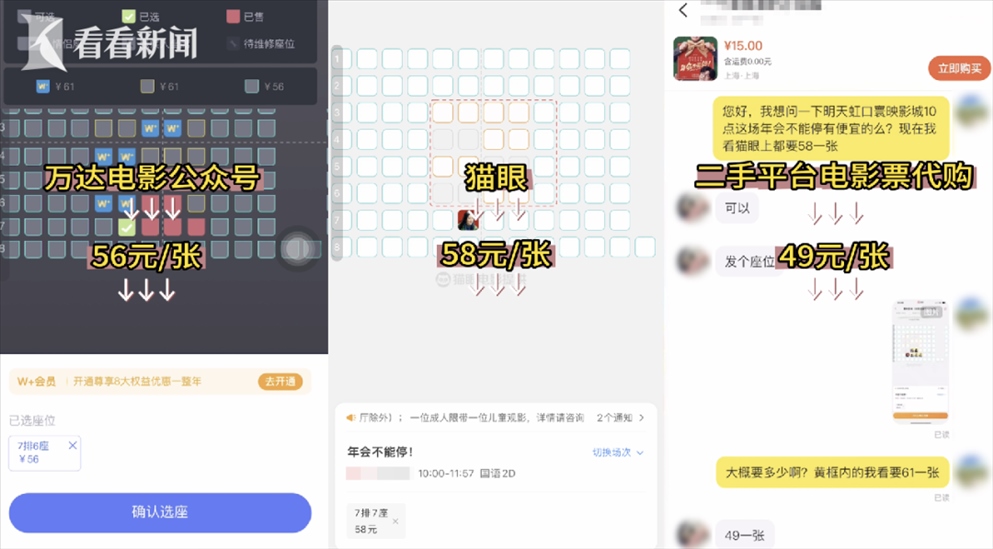 為了求證這一說法,記者來到了網(wǎng)友爆料的這家電影院,并提前通過三種渠道在線上購入了同天、同電影院、同場次、同排位置的三張電影票,分別花費(fèi)了56元、58元、49元。
