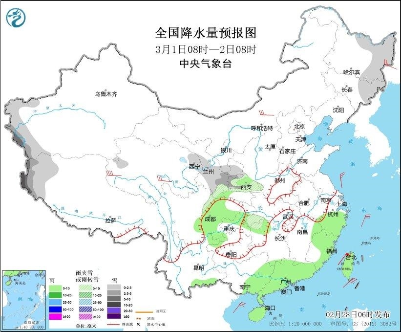 2月28日08時至29日08時,內(nèi)蒙古東北部、東北地區(qū)、西藏東部、西北地區(qū)中東部、川西高原北部、山西南部等地部分地區(qū)有小到中雪或雨夾雪,其中,甘肅河西和東部等地部分地區(qū)有大雪(5~9毫米)。江淮大部、江漢大部、江南、西南地區(qū)東部、華南大部等地部分地區(qū)有小到中雨,其中,湖南中南部、江西中部、廣西東北部等地部分地區(qū)有大雨(25~35毫米)。西藏北部、青海西部等地部分地區(qū)有5~6級風。