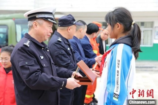 消防員、交警和電力工作人員聯(lián)合為學(xué)生代表頒發(fā)“安全小衛(wèi)士”證書,定期對學(xué)生傳授相關(guān)安全知識。李玲 攝