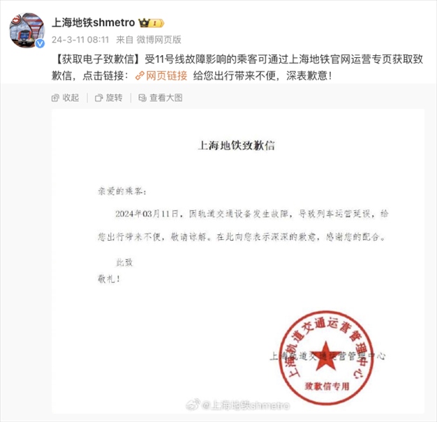 上海地鐵11號(hào)線因車輛故障限速運(yùn)行預(yù)計(jì)晚點(diǎn)15分鐘以上,官方致歉