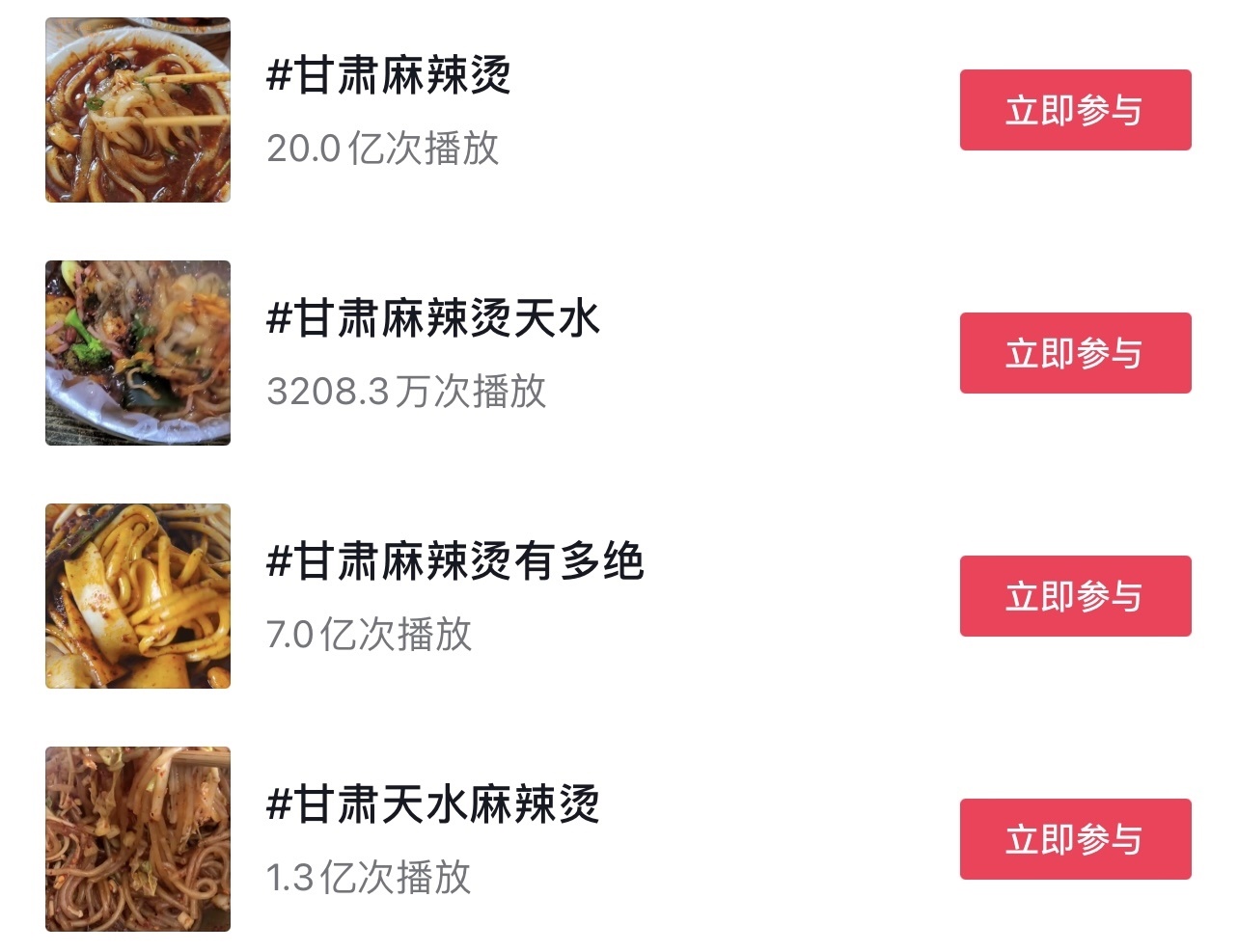 “這兩條視頻吸引了大量網(wǎng)民觀看、點(diǎn)贊、轉(zhuǎn)發(fā),之后陸續(xù)有網(wǎng)民發(fā)布相關(guān)視頻?!?月18日,甘肅省文化和旅游廳在回復(fù)網(wǎng)友建議中提到,3月份以來,“甘肅麻辣燙”話題迅速發(fā)酵,視頻內(nèi)容迅速增加,多次登上抖音、快手等短視頻平臺(tái)熱榜。截至3月16日18:00,各大短視頻平臺(tái)上“甘肅麻辣燙”相關(guān)話題累計(jì)播放量已超過32.6億次。
