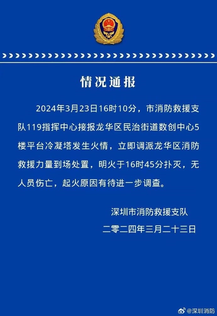 央視網(wǎng)消息:深圳市消防救援支隊(duì)發(fā)布情況通報,2024年3月23日16時10分,市消防救援支隊(duì)119指揮中心接報龍華區(qū)民治街道數(shù)創(chuàng)中心5樓平臺冷凝塔發(fā)生火情,立即調(diào)派龍華區(qū)消防救援力量到場處置,明火于16時45分撲滅,無人員傷亡,起火原因有待進(jìn)一步調(diào)查。