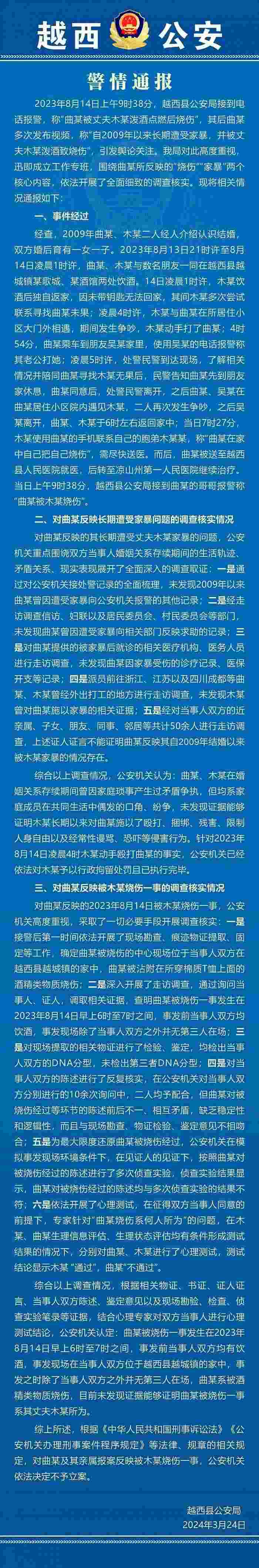 3月24日,越西縣公安局對此發(fā)布警情通報(bào)稱,綜合調(diào)查情況,根據(jù)相關(guān)物證、書證、證人證言、當(dāng)事人雙方陳述、鑒定意見以及現(xiàn)場勘驗(yàn)、檢查、偵查實(shí)驗(yàn)筆錄等證據(jù),結(jié)合心理專家對雙方當(dāng)事人進(jìn)行心理測試結(jié)論,公安機(jī)關(guān)認(rèn)定:曲某被燒傷一事發(fā)生在2023年8月14日早上6時(shí)至7時(shí)之間,事發(fā)前當(dāng)事人雙方均有飲酒,事發(fā)現(xiàn)場在當(dāng)事人雙方位于越西縣越城鎮(zhèn)的家中,事發(fā)之時(shí)除了當(dāng)事人雙方之外并無第三人在場,曲某系被酒精類物質(zhì)燒傷,目前未發(fā)現(xiàn)證據(jù)能夠證明曲某被燒傷一事系其丈夫木某所為。警方表示,對曲某及其親屬報(bào)案反映被木某燒傷一事,公安機(jī)關(guān)依法決定不予立案。