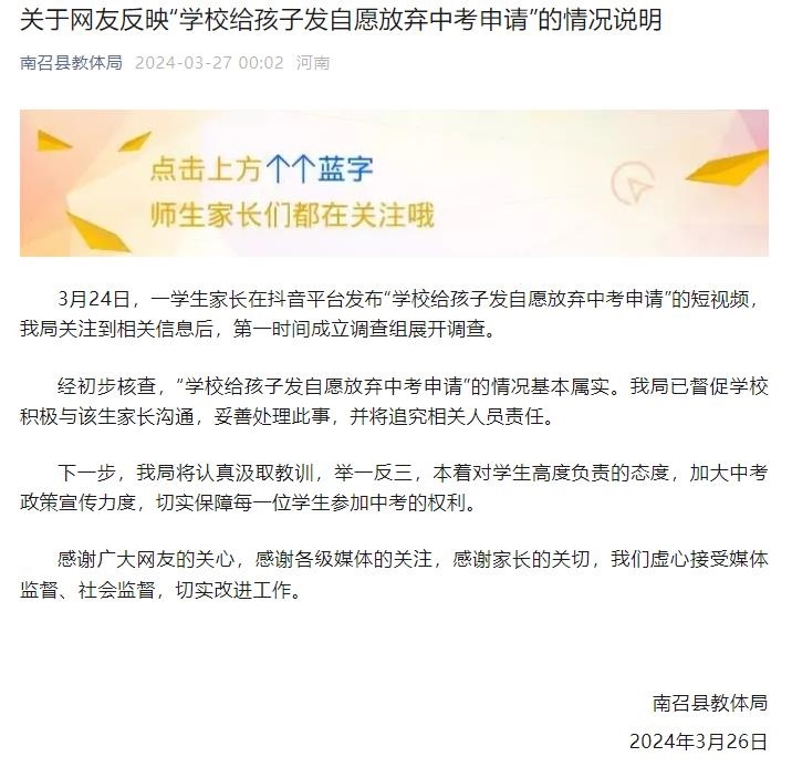 央視網(wǎng)消息:南召縣教體局3月27日發(fā)布《關(guān)于網(wǎng)友反映“學(xué)校給孩子發(fā)自愿放棄中考申請(qǐng)”的情況說(shuō)明》。