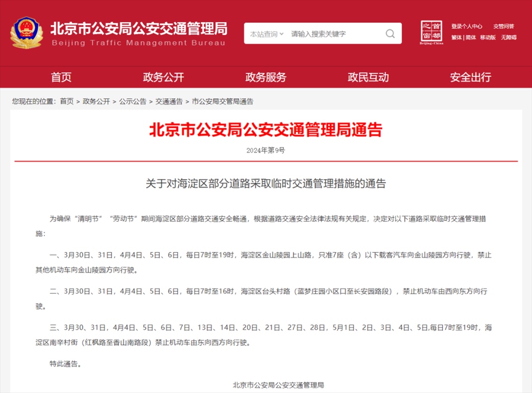 央視網(wǎng)消息:據(jù)北京市公安局公安交通管理局消息,3月26日,北京市交管局網(wǎng)站發(fā)布《關(guān)于對海淀區(qū)部分道路采取臨時交通管理措施的通告》,為確保“清明節(jié)”“勞動節(jié)”期間海淀區(qū)部分道路交通安全暢通,根據(jù)道路交通安全法律法規(guī)有關(guān)規(guī)定,決定對以下道路采取臨時交通管理措施。
