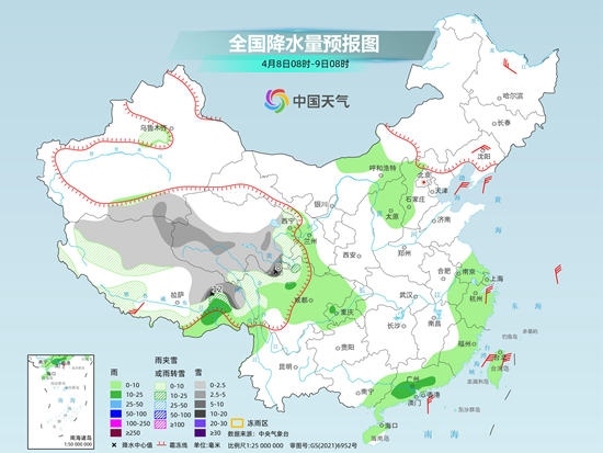 具體來看,中央氣象臺預計,今天,新疆伊犁河谷、西藏大部、青海中南部、川西高原北部等地部分地區(qū)有小到中雪或雨夾雪,其中,西藏東南部、青海東南部、川西高原北部等地部分地區(qū)有大到暴雪。山西北部、河北西部、甘肅西南部、西藏東南部、四川中北部、重慶大部、江蘇南部、安徽東南部、上海、浙江大部、福建大部、廣西東部、廣東大部、海南西北部等地部分地區(qū)有小到中雨。