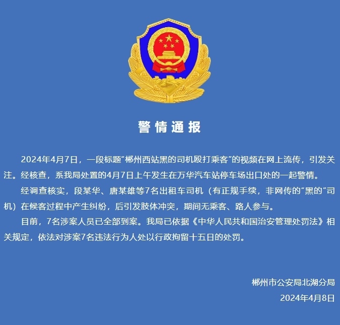 經(jīng)調(diào)查核實,段某華、唐某雄等7名出租車司機(有正規(guī)手續(xù),非網(wǎng)傳的“黑的”司機)在候客過程中產(chǎn)生糾紛,后引發(fā)肢體沖突,期間無乘客、路人參與。