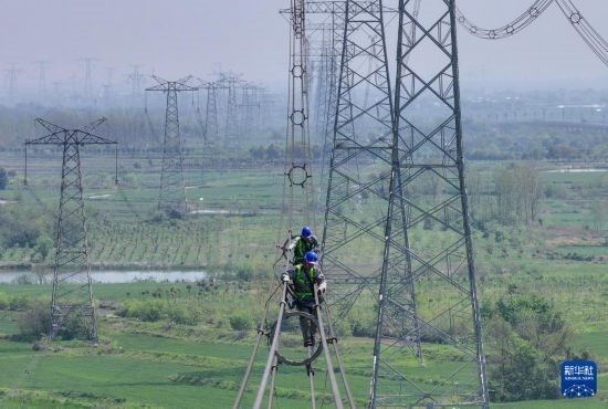4月9日,在位于安徽省合肥市廬江縣郭河鎮(zhèn)的直流±800千伏建蘇線3418號桿塔處,國網(wǎng)合肥供電公司工人進行高空檢修作業(yè)(無人機照片)。
