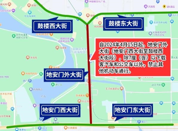 為確保全國(guó)重點(diǎn)文物保護(hù)單位“大運(yùn)河——玉河故道(澄清上閘含萬(wàn)寧橋)”的文物安全與交通安全,根據(jù)文物保護(hù)和道路交通安全有關(guān)法律法規(guī)規(guī)定,決定自2024年4月15日起,地安門(mén)外大街(地安門(mén)西大街至鼓樓西大街段),除7座(含)以下載客汽車和公交車以外,禁止其他機(jī)動(dòng)車通行。