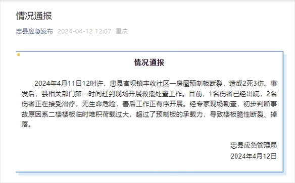 央視網(wǎng)消息:據(jù)“忠縣應急發(fā)布”公眾號消息,重慶忠縣應急管理局通報,2024年4月11日12時許,忠縣官壩鎮(zhèn)豐收社區(qū)一房屋預制板斷裂,造成2死3傷。事發(fā)后,縣相關(guān)部門第一時間趕到現(xiàn)場開展救援處置工作。目前,1名傷者已經(jīng)出院,2名傷者正在接受治療,無生命危險,善后工作正有序開展。經(jīng)專家現(xiàn)場勘查,初步判斷事故原因系二樓樓板臨時堆積荷載過大,超過了預制板的承載力,導致樓板脆性斷裂、掉落。