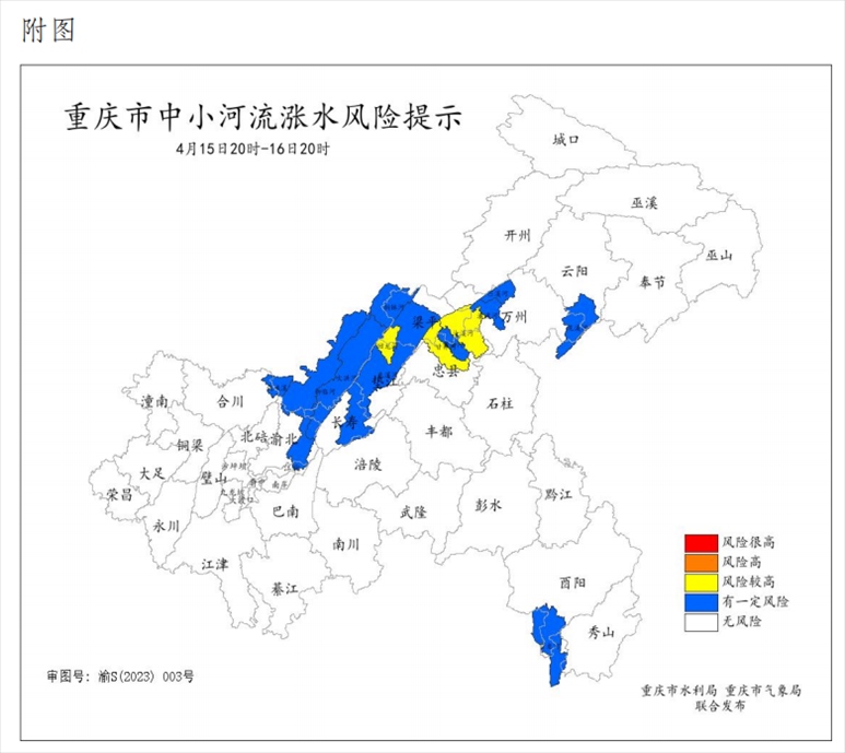 4月15日16時,重慶市水利局和重慶市氣象局聯(lián)合發(fā)布中小河流漲水風險提示:預計4月15日20時至4月16日20時,重慶11個區(qū)縣部分中小河流有漲水風險。相關區(qū)縣需加強值班值守,密切關注水雨情變化,注意做好防范工作。