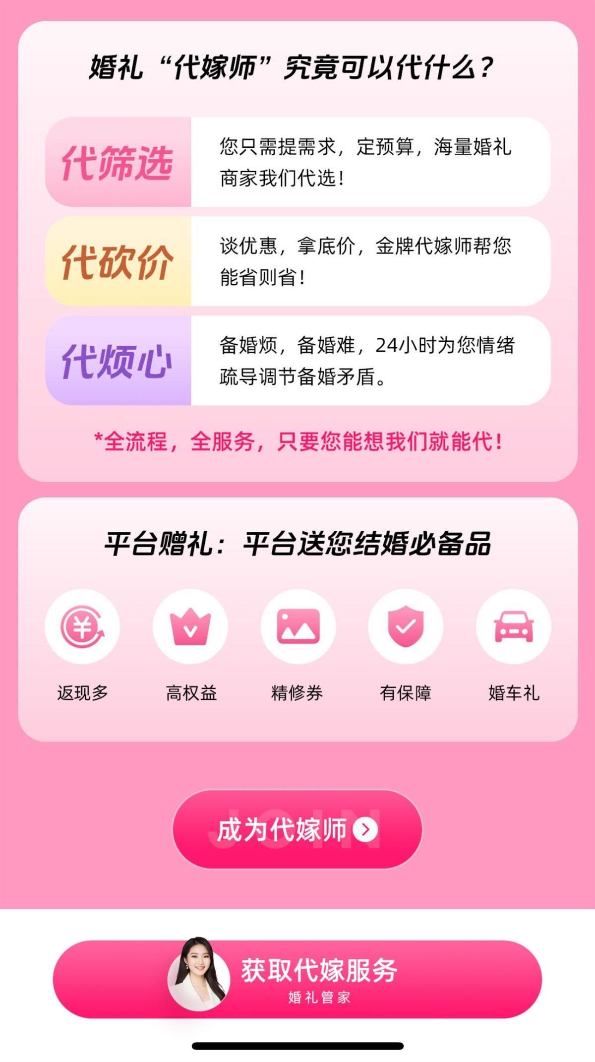 該頁面還宣傳稱,代嫁師可以“代篩選”“代砍價(jià)”“代煩心”,并且還有一行字強(qiáng)調(diào):“全流程,全服務(wù),只要您能想,代嫁師就能代。”
