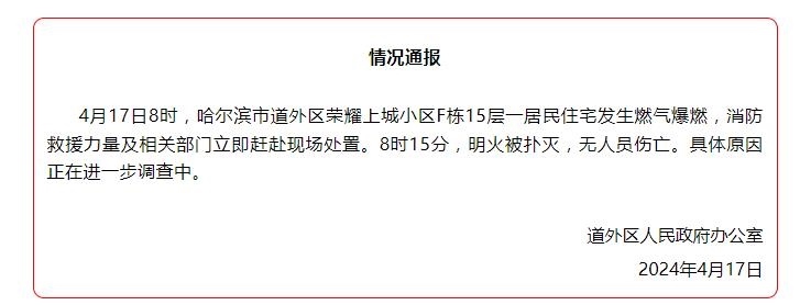 央視網(wǎng)消息:據(jù)“記憶道外”官微消息,哈爾濱市道外區(qū)人民政府辦公室發(fā)布情況通報,4月17日8時,哈爾濱市道外區(qū)榮耀上城小區(qū)F棟15層一居民住宅發(fā)生燃氣爆燃,消防救援力量及相關部門立即趕赴現(xiàn)場處置。8時15分,明火被撲滅,無人員傷亡。具體原因正在進一步調查中。
