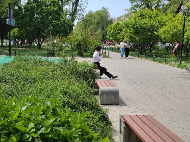 中午1時(shí),走進(jìn)北京明城墻遺址公園,春色襲人。玉棠廣場(chǎng)中,半數(shù)以上的人身著偏正式服裝或佩戴著工牌。他們有的獨(dú)坐小憩,有的兩人結(jié)伴,有的三五成群。在亭廊軒組合處,四位女士圍坐在一起交流生活中的小事,不時(shí)傳出陣陣笑聲。