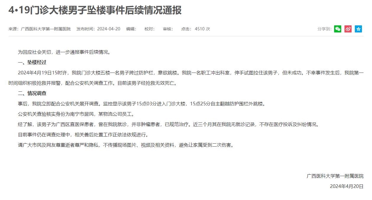 央視網(wǎng)消息:據(jù)廣西醫(yī)科大學(xué)第一附屬醫(yī)院網(wǎng)站消息,4月20日,廣西醫(yī)科大學(xué)第一附屬醫(yī)院發(fā)布《4·19門診大樓男子墜樓事件后續(xù)情況通報(bào)》。全文如下: