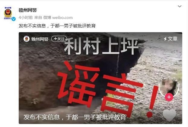 中新網(wǎng)4月26日電 據(jù)贛州市公安局網(wǎng)絡(luò)安全保衛(wèi)支隊官方微博消息,受近期持續(xù)強降雨影響,贛州市多地遭受洪澇災(zāi)害。4月22日,于都縣公安局網(wǎng)安大隊在工作中發(fā)現(xiàn),網(wǎng)民鐘某在短視頻平臺發(fā)布了一張道路被雨水沖斷的圖片,并配以“于都縣利村鄉(xiāng)上坪村熱點新聞事件,雨天出行注意安全”等引人遐想的文字,引起網(wǎng)民熱議。