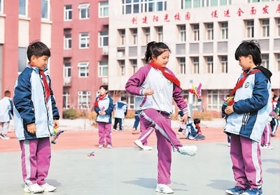河北省邢臺(tái)市廣宗縣第四小學(xué)學(xué)生在課間踢毽子。王 壘攝(人民視覺)