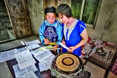 薅草鑼鼓傳承人吳正菊(左)教授女兒廖傳述薅草鑼鼓知識。張勇攝