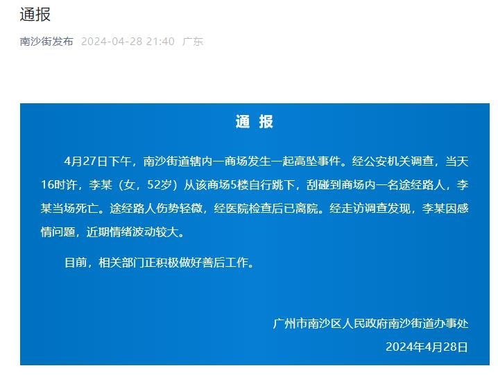 央視網(wǎng)消息:廣州南沙街道4月28日晚通報(bào),4月27日下午,南沙街道轄內(nèi)一商場發(fā)生一起高墜事件。經(jīng)公安機(jī)關(guān)調(diào)查,當(dāng)天16時(shí)許,李某(女,52歲)從該商場5樓自行跳下,刮碰到商場內(nèi)一名途經(jīng)路人,李某當(dāng)場死亡。途經(jīng)路人傷勢輕微,經(jīng)醫(yī)院檢查后已離院。經(jīng)走訪調(diào)查發(fā)現(xiàn),李某因感情問題,近期情緒波動較大。目前,相關(guān)部門正積極做好善后工作。