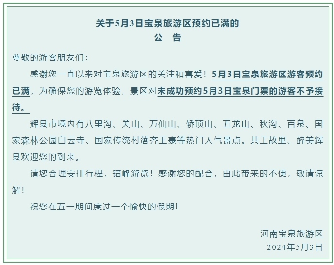央視網(wǎng)消息:據(jù)“河南寶泉旅游區(qū)”公眾號消息,景區(qū)發(fā)布公告,5月3日寶泉旅游區(qū)游客預(yù)約已滿,為確保游覽體驗,對未成功預(yù)約5月3日寶泉門票的游客不予接待。