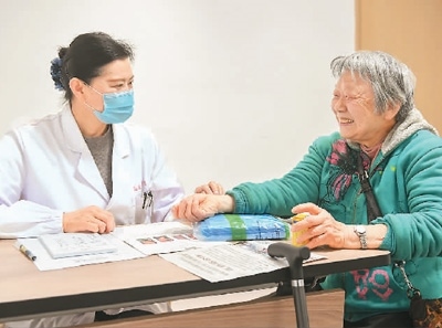 安徽省合肥市廬陽區(qū)養(yǎng)老服務(wù)指導(dǎo)中心與安徽中醫(yī)藥大學(xué)門診部(國(guó)醫(yī)堂)醫(yī)聯(lián)體合作揭牌,該醫(yī)聯(lián)體開設(shè)中醫(yī)科門診,助力老年群體樂享健康的晚年生活。圖為安徽中醫(yī)藥大學(xué)門診部(國(guó)醫(yī)堂)專家(左)為廬陽區(qū)老年人義診治療。袁 兵攝(人民圖片)