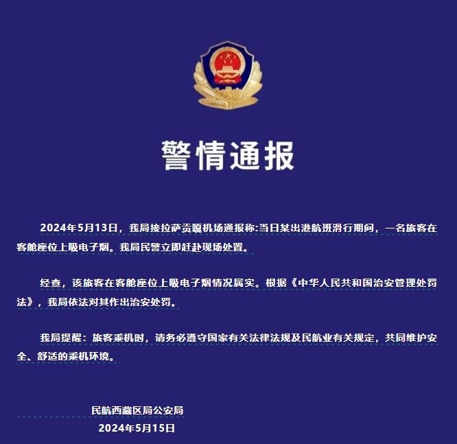 央視網(wǎng)消息:據(jù)民航西藏自治區(qū)管理局公眾號(hào)消息,5月15日,民航西藏區(qū)局公安局發(fā)布警情通報(bào)稱,5月13日,拉薩貢嘎機(jī)場(chǎng)某出港航班滑行期間,一名旅客在客艙座位上吸電子煙,民航西藏區(qū)局公安局民警立即趕赴現(xiàn)場(chǎng)處置。