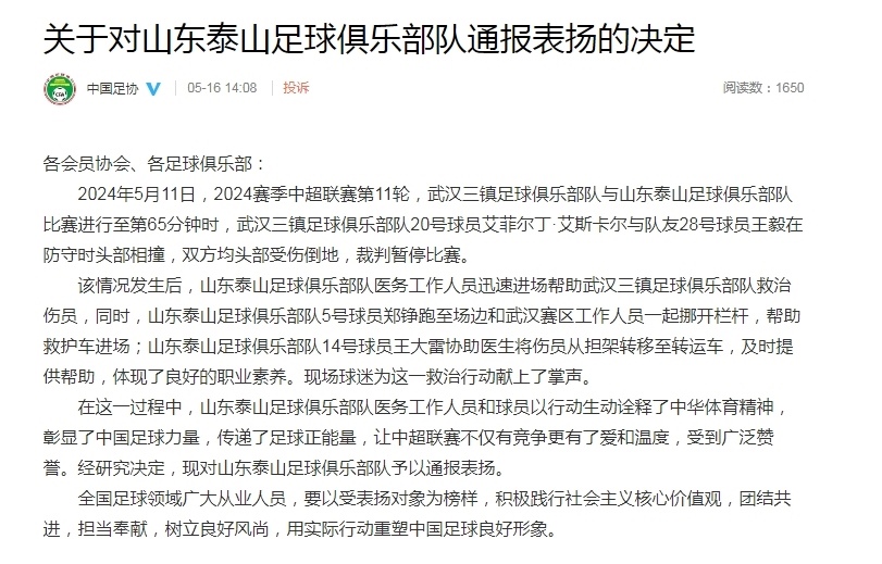 ·幫助救治武漢三鎮(zhèn)足球俱樂部隊傷員,中國足協通報表揚山東泰山俱樂部。