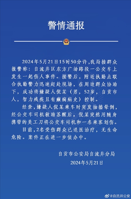 ·四川自貢警方通報“一男子在公交車上用美工刀劃傷司機(jī)和乘客”:男子智力殘疾且患有癲癇病史。