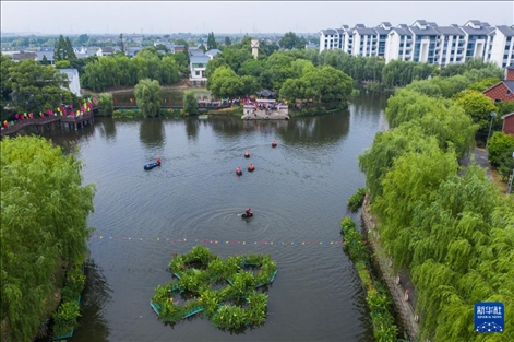 5月25日,村民們參加水鄉(xiāng)劃菱桶比賽。菱桶是河網(wǎng)密布的東林鎮(zhèn)百姓家中常見的一種傳統(tǒng)水上勞動工具,村民在捕魚、采菱、采荷時都要用到(無人機照片)。