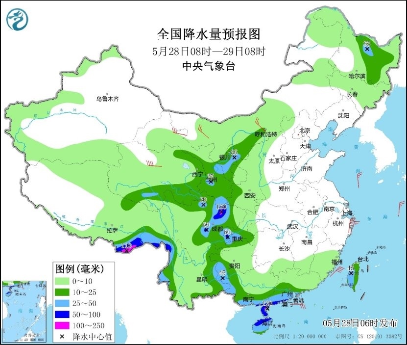 預(yù)計今天,廣西南部和西部、廣東西南部、海南島、貴州西南部、云南東部和西北部、四川盆地西部、重慶西部、西藏東南部等地的部分地區(qū)有大到暴雨,其中,廣東西南部、海南島北部、四川盆地西北部、西藏東南部等地局地有大暴雨(100~120毫米)。上述部分地區(qū)伴有短時強降水(最大小時降雨量30~50毫米,局地可超過60毫米),局地有雷暴大風(fēng)等強對流天氣。